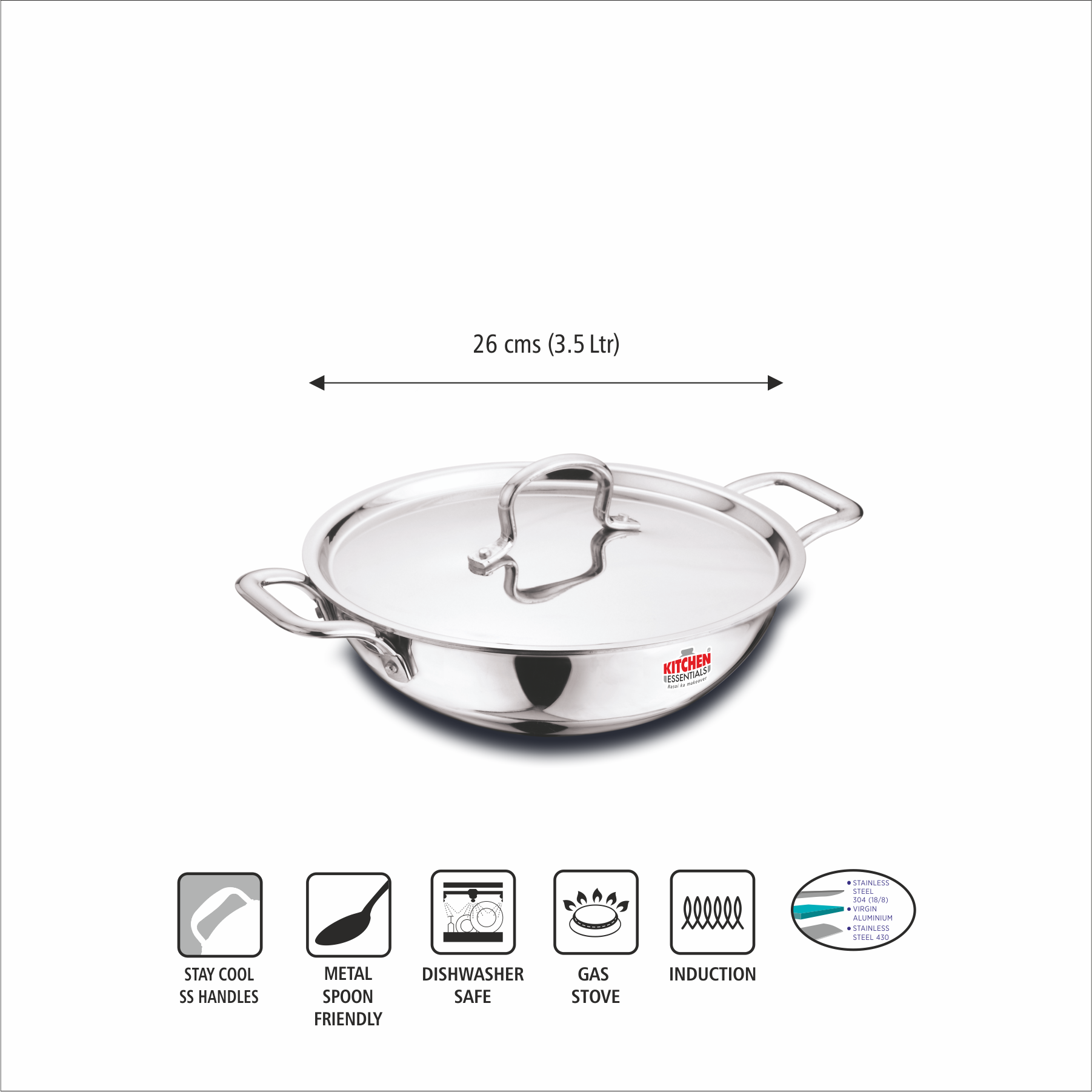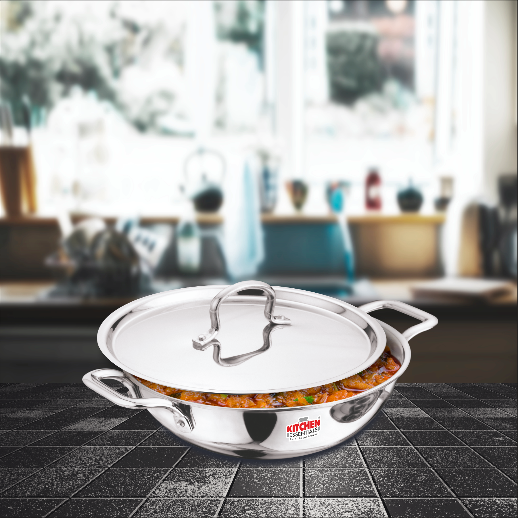 Kitchen Essentials SS Triply Cookware is crafted using the innovative SAS technology by fusing 3 layers – Stainless Steel SS 304 (18/8), Virgin Aluminium and SS 430. The inner layer of Stainless Steel for rust-free, healthy cooking. The middle layer of Aluminium for even heat distribution & uniform cooking. The outer layer of Stainless Steel for durability and a lustrous, scratch-resistant exterior. SS Cookware is manufactured in our State-of-the-Art plant. It works on both gas and induction hobs.