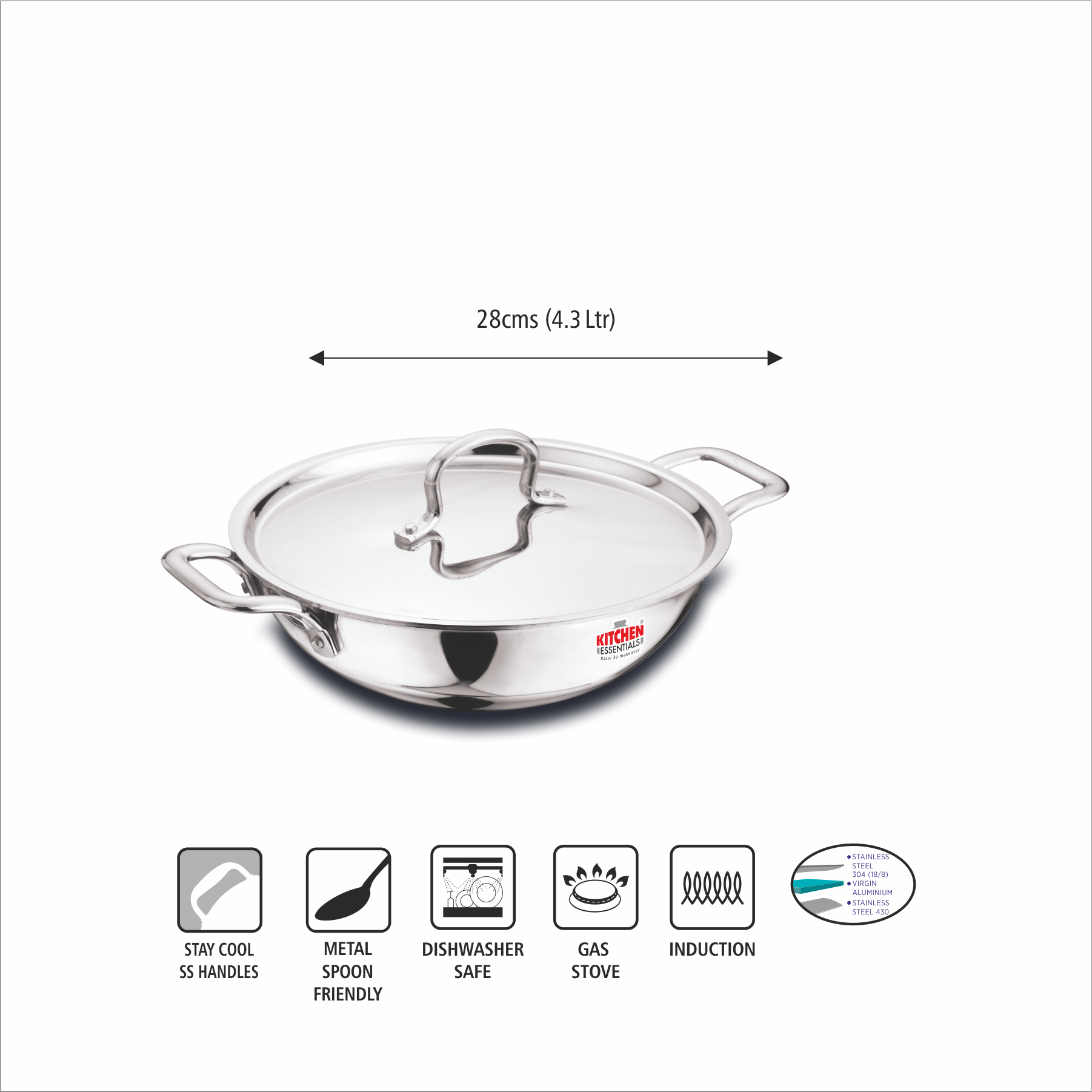 Kitchen Essentials SS Triply Cookware is crafted using the innovative SAS technology by fusing 3 layers – Stainless Steel SS 304 (18/8), Virgin Aluminium and SS 430. The inner layer of Stainless Steel for rust-free, healthy cooking. The middle layer of Aluminium for even heat distribution & uniform cooking. The outer layer of Stainless Steel for durability and a lustrous, scratch-resistant exterior. SS Cookware is manufactured in our State-of-the-Art plant. It works on both gas and induction hobs.