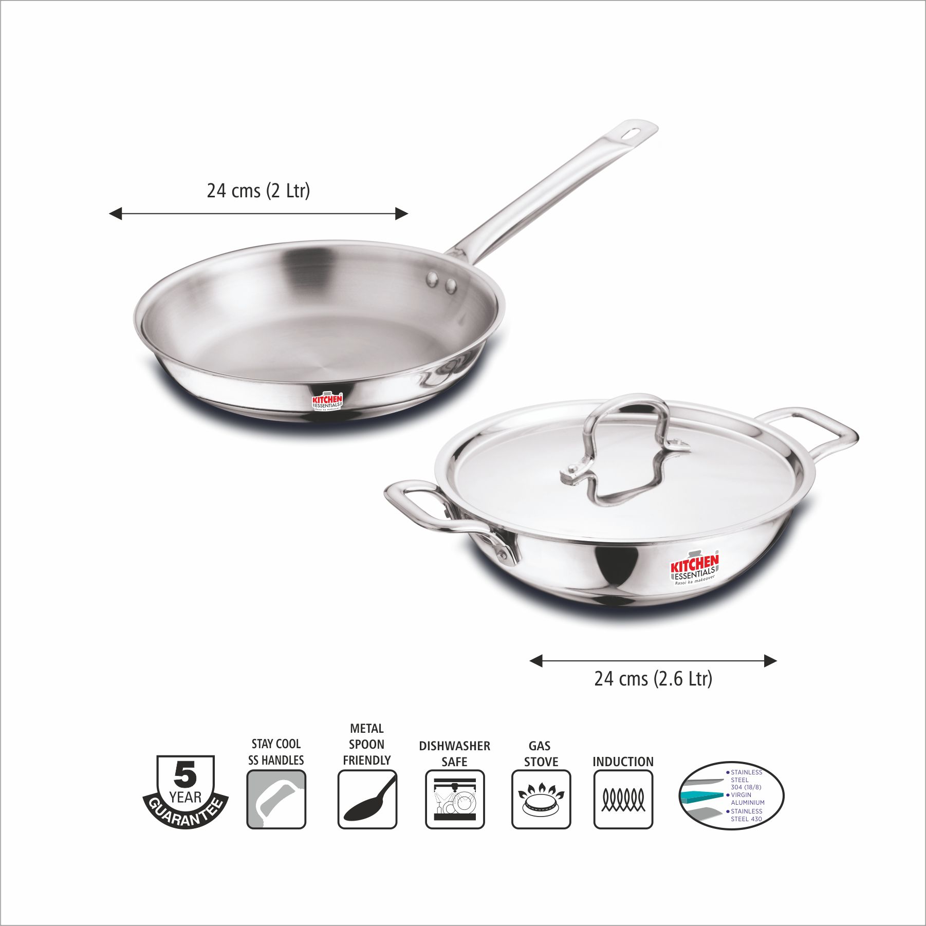 Kitchen Essentials SS Triply Cookware is crafted using the innovative SAS technology by fusing 3 layers – Stainless Steel SS 304 (18/8), Virgin Aluminium and SS 430. The inner layer of Stainless Steel for rust-free, healthy cooking. The middle layer of Aluminium for even heat distribution & uniform cooking. The outer layer of Stainless Steel for durability and a lustrous, scratch-resistant exterior. SS Cookware is manufactured in our State-of-the-Art plant. It works on both gas and induction hobs.